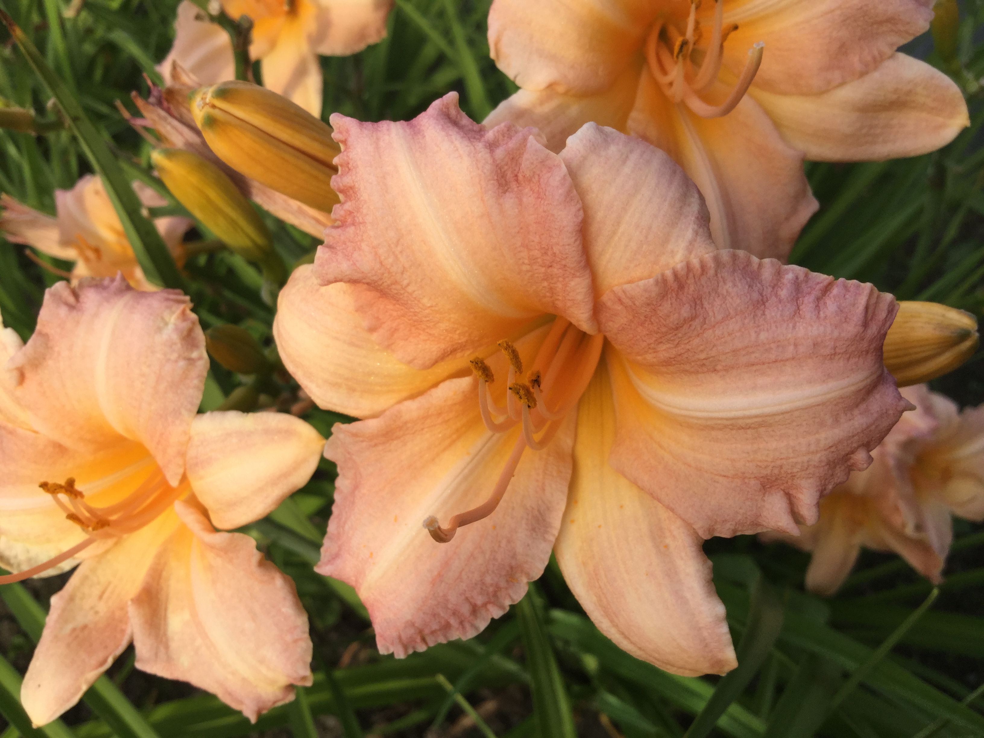 Цветение начинается в конце июня, когда над кустом появляются цветоносы с 1-3 цветками на каждом. Цветы среднего размера, диаметром до 12 см, напоминают лилии и имеют яркую окраску: желтая горловина и лепестки лососево-розового цвета.